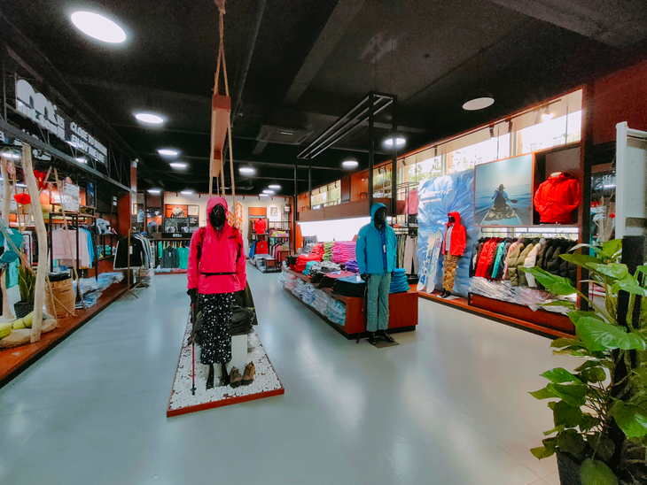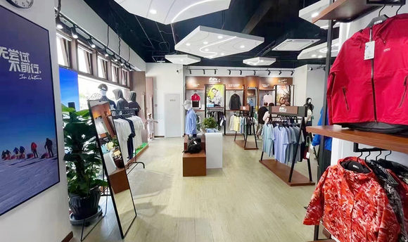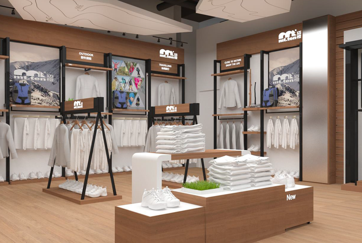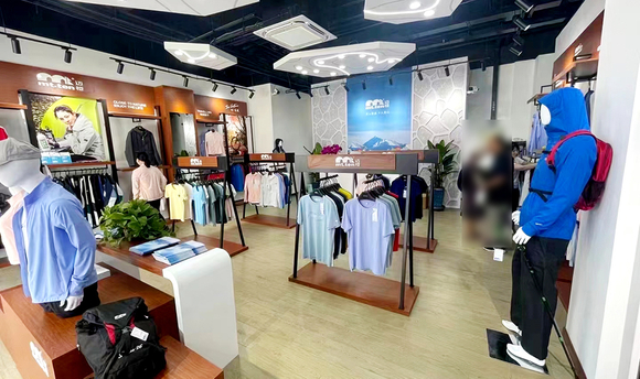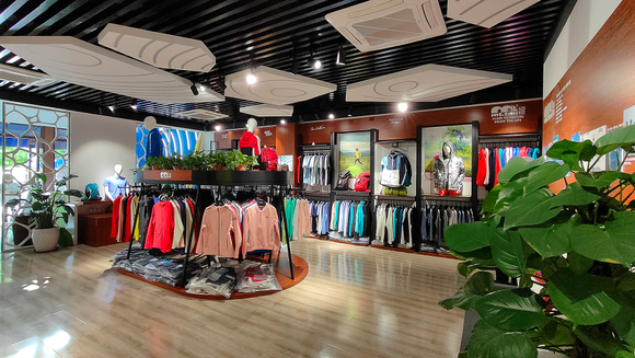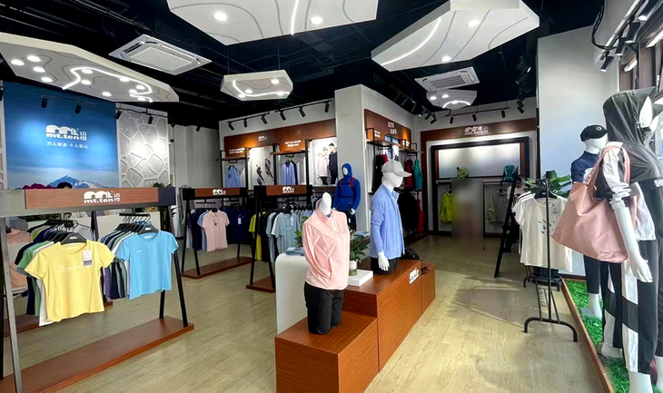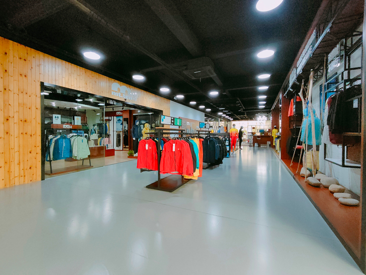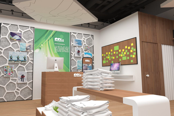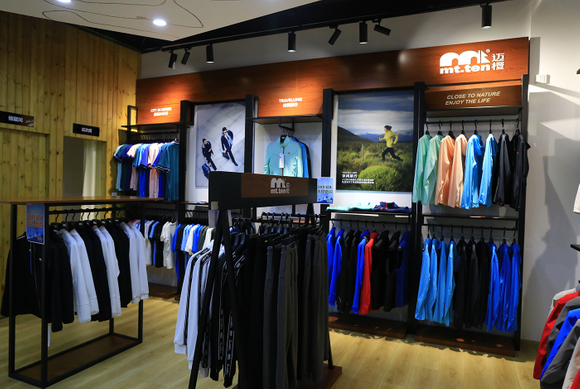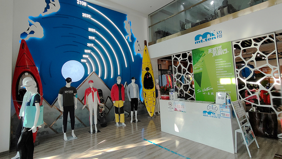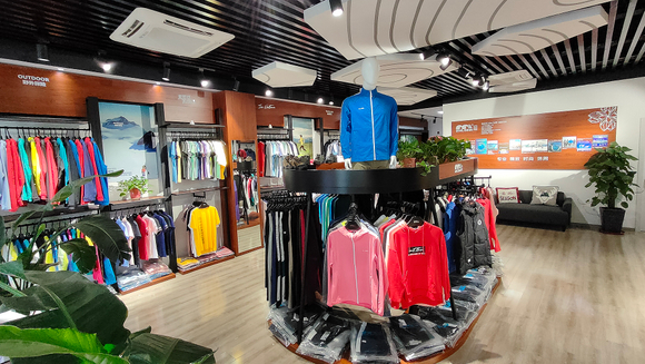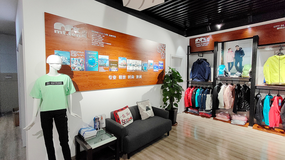 大渔湾迈橙体育形象店,店内一楼陈设迈橙品牌潮流服装,包括休闲、户外、探险等各类专业服装。展示一年四季装备。二楼则设为商务接待会议室,为迈橙相关各类户外活动提供会议场所。