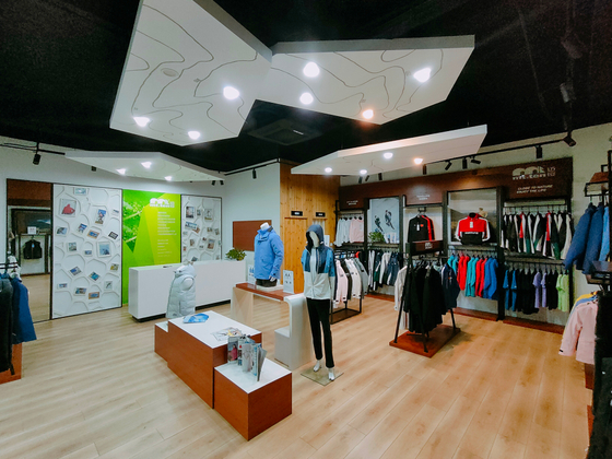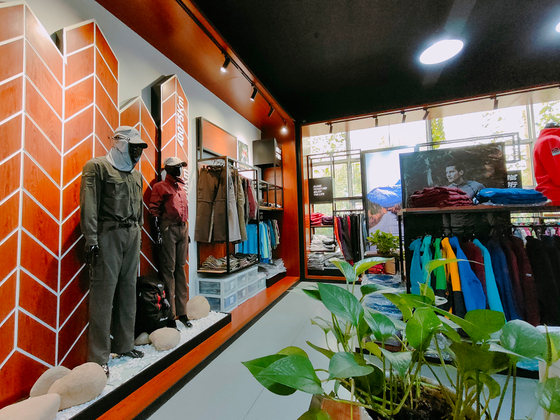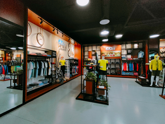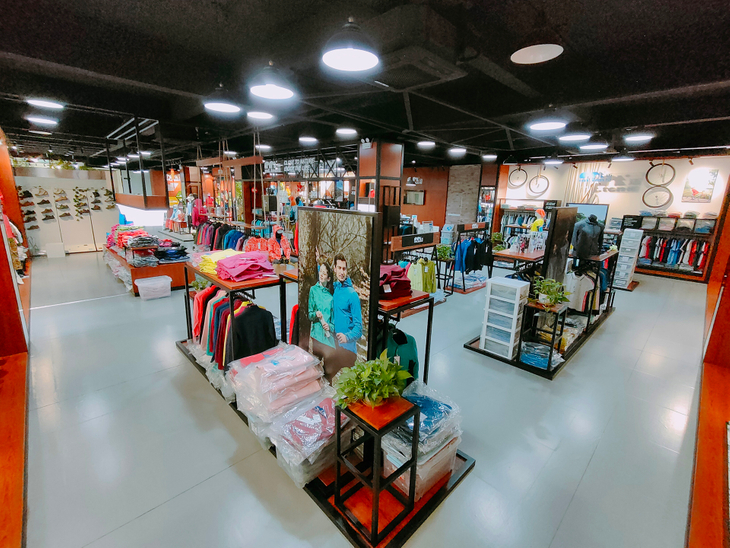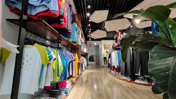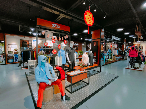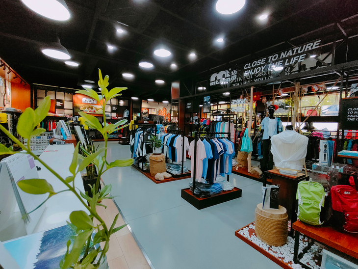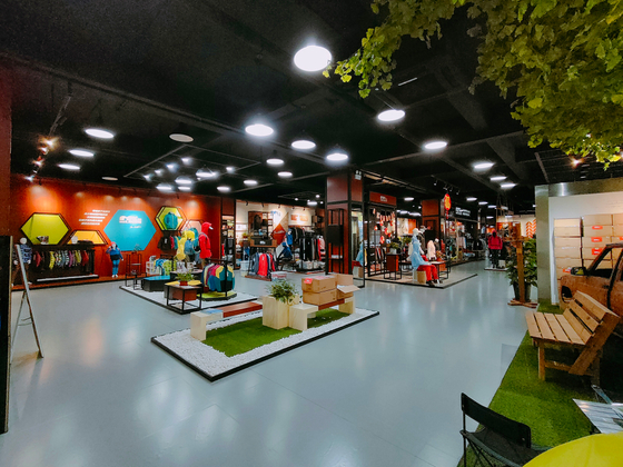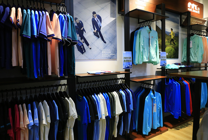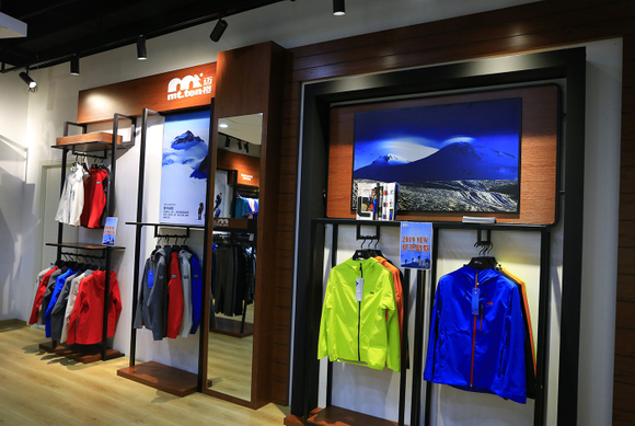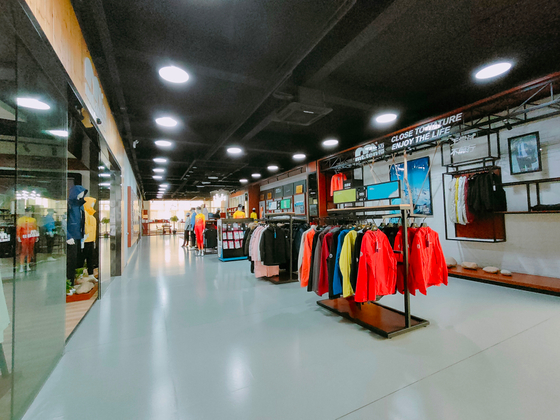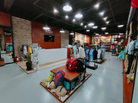 大渔湾迈橙体育形象店,店内一楼陈设迈橙品牌潮流服装,包括休闲、户外、探险等各类专业服装。展示一年四季装备。二楼则设为商务接待会议室,为迈橙相关各类户外活动提供会议场所。