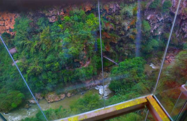 由于时间关系,进入景区后,我们乘坐观光电梯(73.12米)直达谷底,据说是全国第二高的室外钢结构构成观光电梯。进入观光电梯一览峡谷险峻壮观,沿河两岸尽收眼底,随着电梯缓缓下降,距离谷底越来越近,河水轰鸣流淌,给我们带来不一样的视觉与听觉体验。