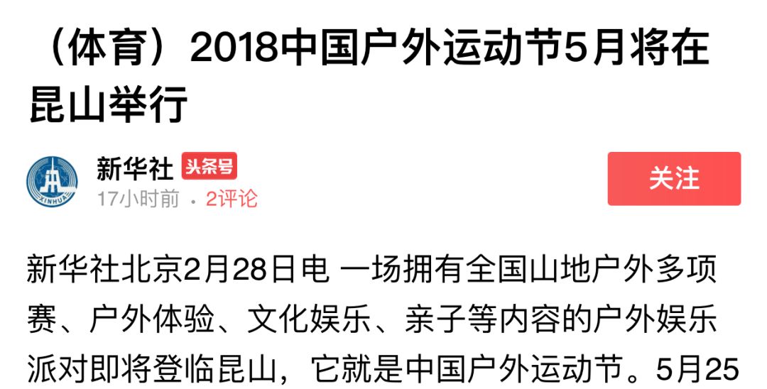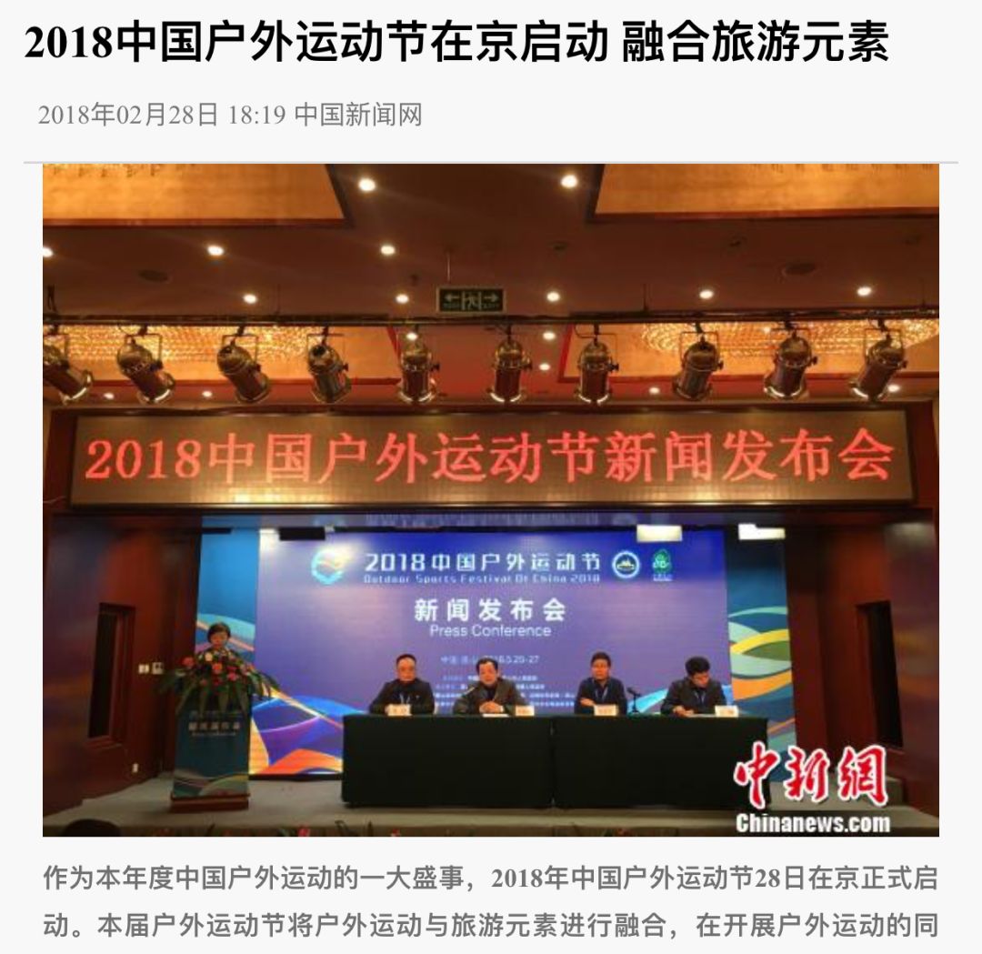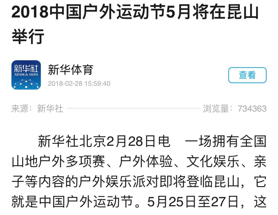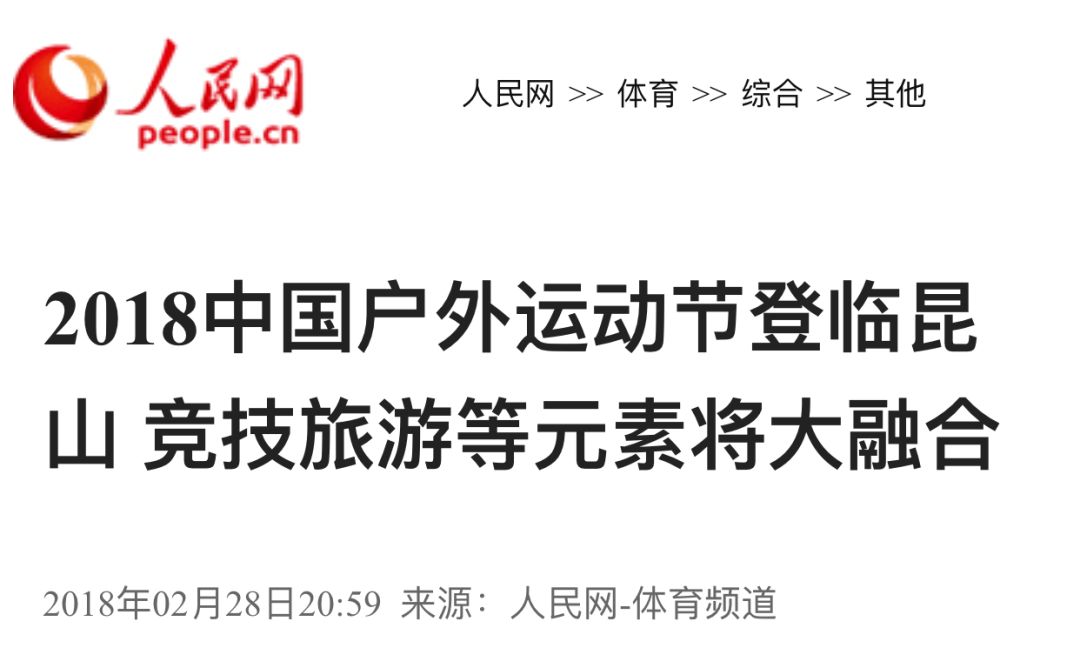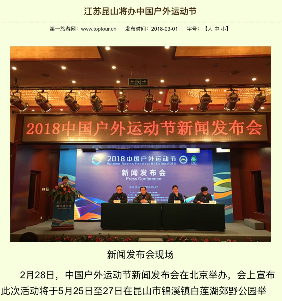 昨天,这则“2018中国户外运动节在京启动,落户昆山”的新闻在新华社、中新网、人民网、中国体育报、第一旅游网等进行了报道,同时,今日头条、网易新闻、搜狐、微博、微信等数百家新闻媒体争相报道,一时之间全国人民都在期待着这场激动人心的“中国户外运动节”。