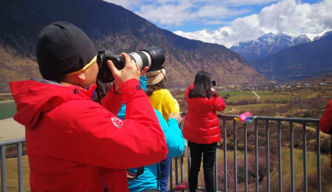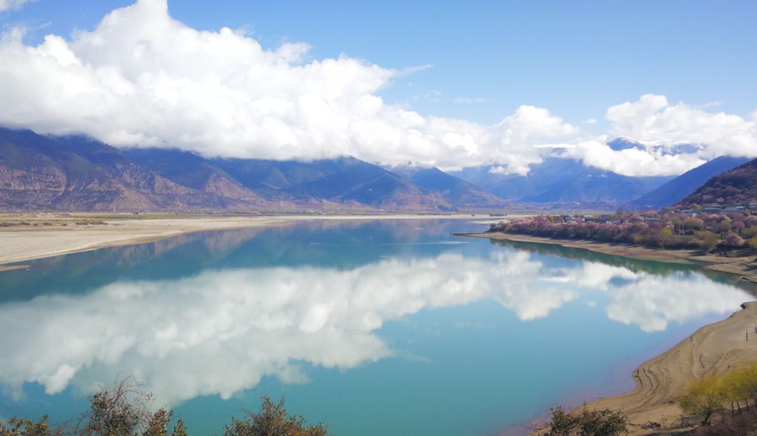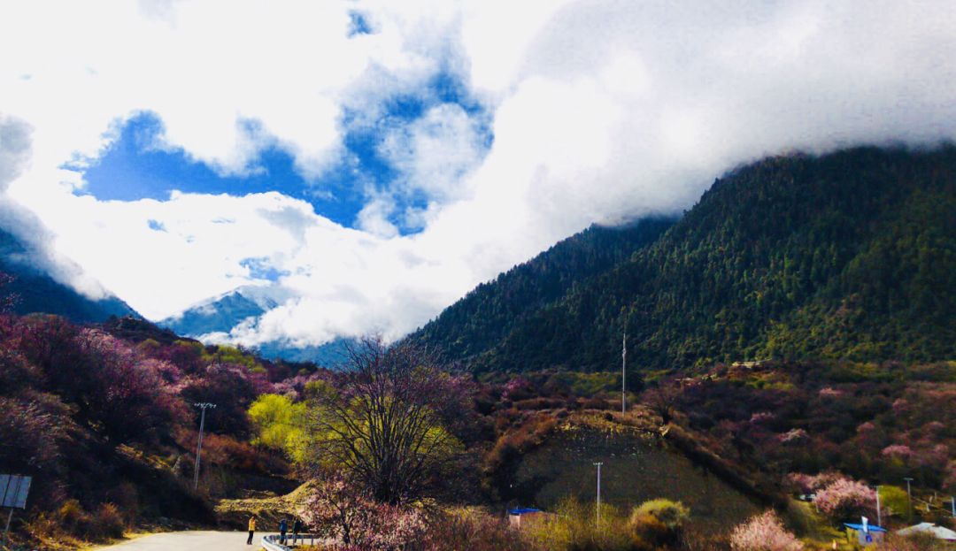 林芝的桃红柳绿映衬着朵朵白云,让人心旷神怡