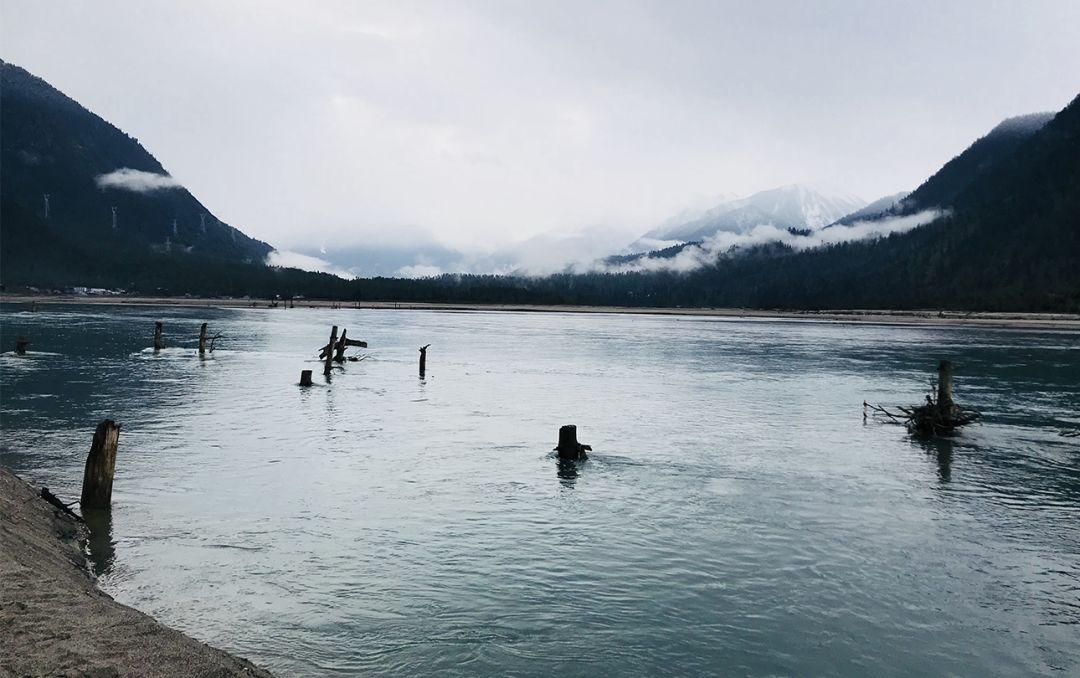 远处雪山雄伟,近处碧波荡漾,植被丰富,湖面上残留的无数树桩,已有几百年的历史。