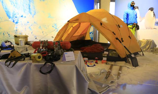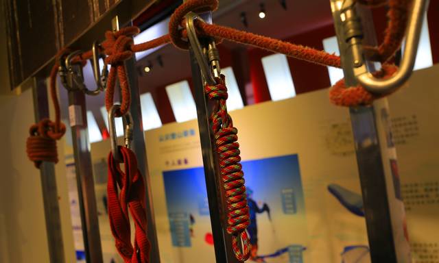 展览中一批登山队使用过的珍贵实物,第一次与大家见面,格外引人瞩目:极地羽绒服、冲锋衣、帐篷、冰镐、绳索等等。